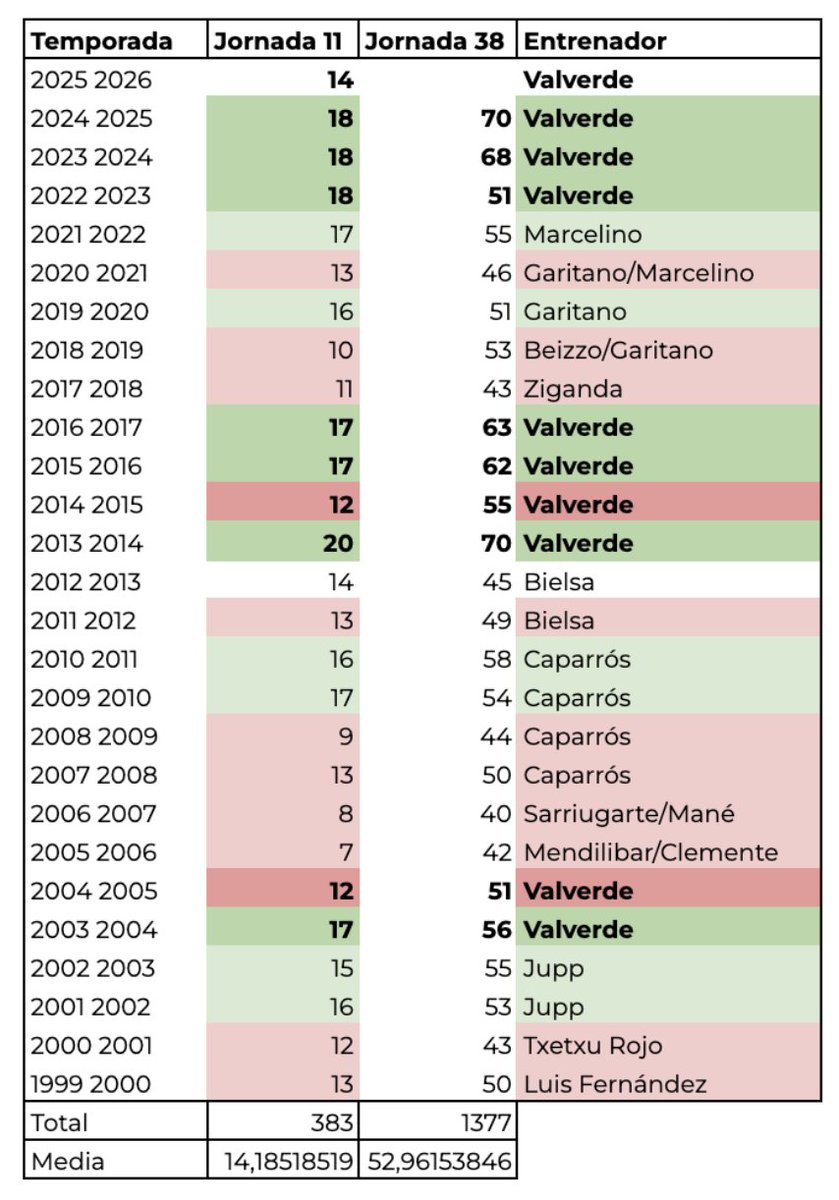 Únicamente 6 temporadas un entrenador que no sea Valverde ha mejorado los 14 actuales y en el mejor de los escenarios con 3 puntos más que ahora. En 10 temporadas el inicio ha sido peor.