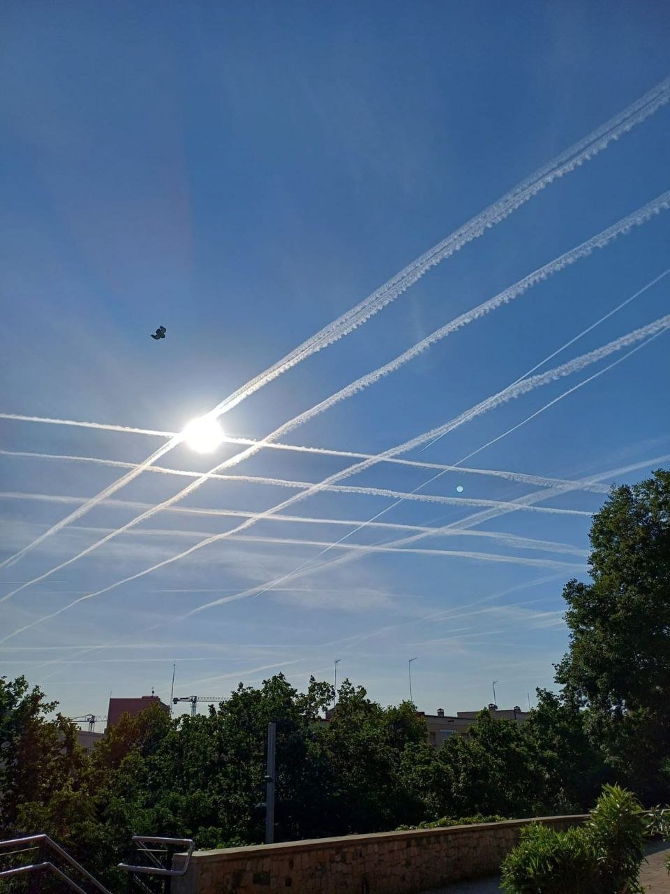 Como ya te han dicho, las estelas que dejan los aviones normales (contrails) son cortas en tiempo y espacio, las estelas que dejan los chemtrails permanecen y se van expandiendo juntándose unas con otras formando esa neblina lechosa que vemos la mayoría de los días (a priori despejados y soleados). De las trayectorias de esos aviones también se podría hablar largo y tendido...
