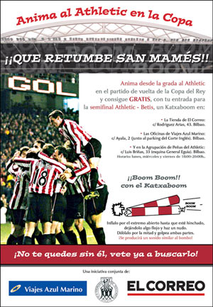 Viajes Azul Marino, la Agrupación de Peñas del Athletic y el diario El Correo regalarán el Katxaboom en una iniciativa conjunta para empujar al Athletic y llevarlo en volandas entre todos hasta la Final de la Copa. ¿Que es un KATXABOOM? Es un hinchable de polietileno,con forma cilíndrica, que provoca un sonido similar al bombo. ¿Cómo puedo conseguir GRATIS mi KATXABOOM? Presentando tu entrada para partido de vuelta de Semifinal de Copa, Athletic - Betis, en: Las oficinas de El Correo: Rodriguez Arias, 43 - Bilbao En las Oficinas de Viajes Azul Marino: C/ Ayala, 2 (junto al parking del Corte Inglés) - Bilbao Y en La Agrupación de Peñas del Athletic C/ Luis Briñas, 33 (esquina General Eguia) - Bilbao Horario, Lunes, Miércoles y Viernes de 18:00 a 20:00 hrs. Los organizadores de esta iniciativa esperan que sea un éxito y podamos ver a el San Mamés más estruendoso que se ha visto nunca.